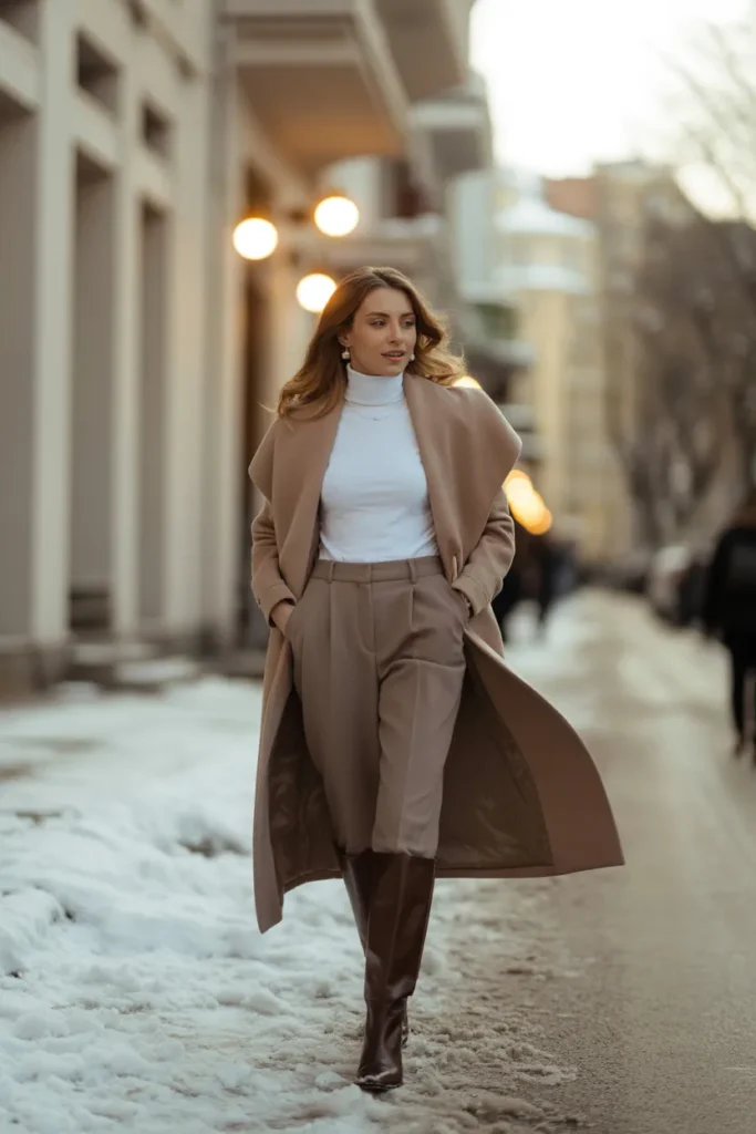 ❄️ 12. Beige Wrap Coat + White Turtleneck + Brown Boots