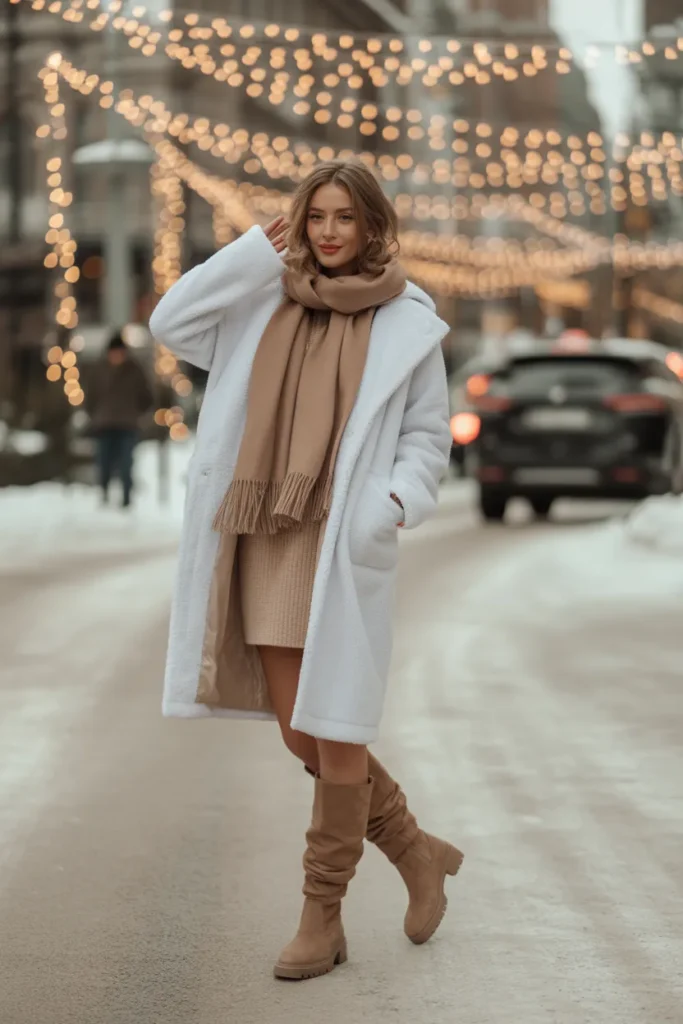 ❄️ 7. White Teddy Coat + Knit Dress + Knee Boots