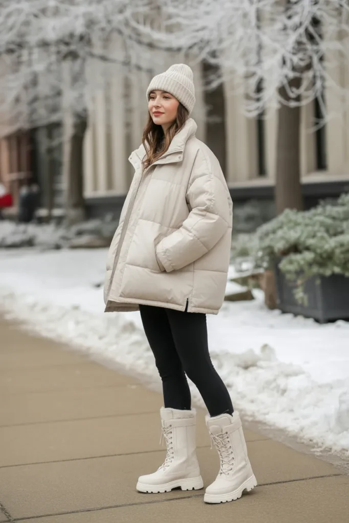 ❄️ 6. Oversized Puffer Jacket + Leggings + Snow Boots