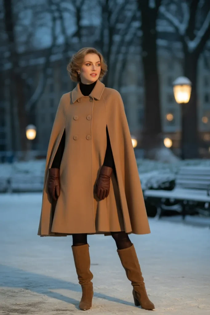 ❄️ 16. Wool Cape Coat + Gloves + Tall Suede Boots