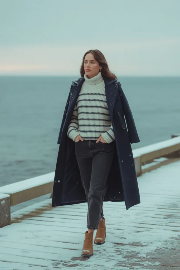 ❄️ 21. Navy Peacoat + Striped Sweater + Dark Jeans