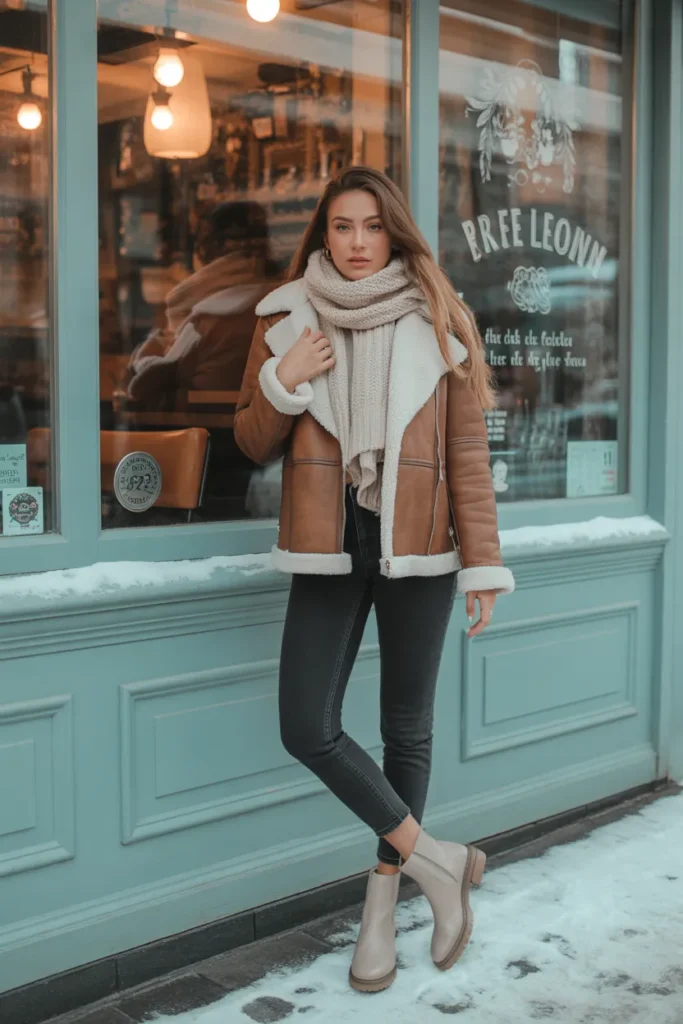 ❄️ 17. Brown Shearling Jacket + Skinny Jeans + Ankle Boots
