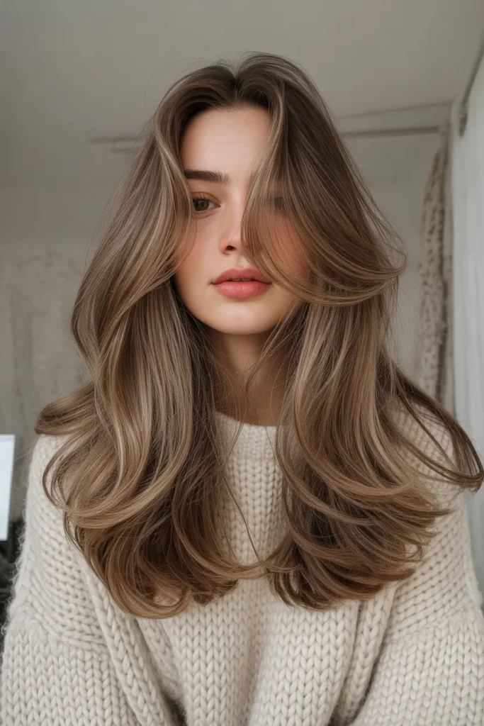 Long layers with wispy bangs create a soft, romantic hairstyle that feels light and youthful. The bangs gently skim the forehead, adding softness without dominating the face. Long layers add flow and prevent the hair from appearing flat or weighed down.