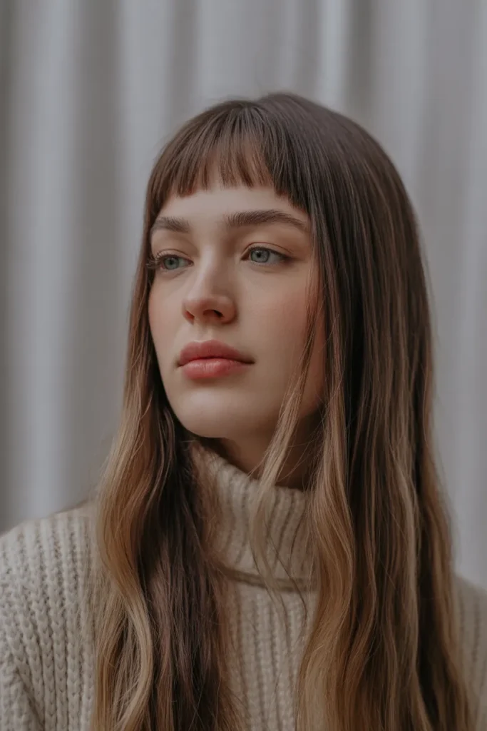 Long hair paired with micro bangs creates a striking and artistic contrast. The short bangs draw attention to the eyes, while the flowing length adds balance and softness.