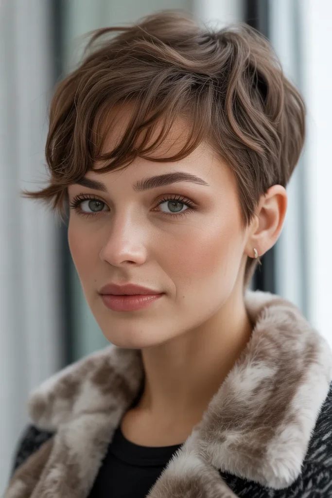 The modern pixie cut features soft edges and gentle layering for a wearable, feminine finish. This haircut highlights facial features while maintaining a smooth and approachable shape. The softened texture adds flexibility to the overall look.