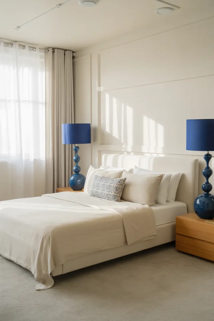 A simple white space gets a royal upgrade with just a few blue accents. The lamps bring color without cluttering the calm atmosphere.