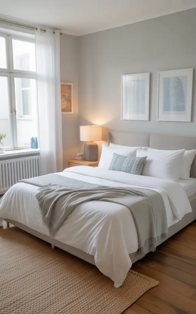Add cozy layers — fluffy blankets, light curtains, and soft cushions — for that “floating in comfort” feeling. It’s simplicity with an airy, soothing touch.