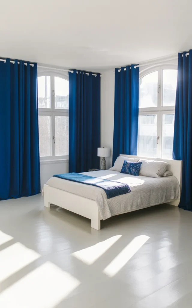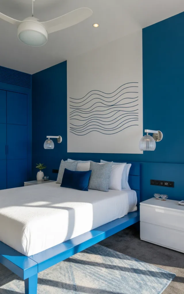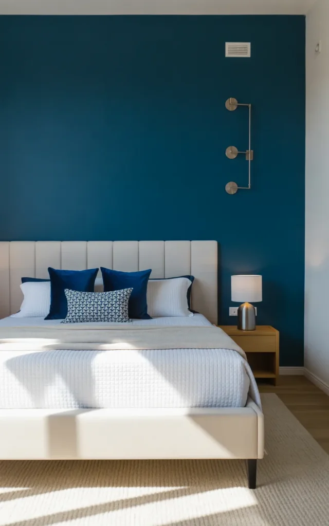 An accent wall is an easy way to make your bedroom stand out. The bold blue creates depth, while white bedding and silver touches keep the look clean and balanced.