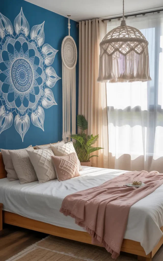 This boho look mixes creative energy with peaceful tones. The blue art brings focus, while white keeps the space open and calm.