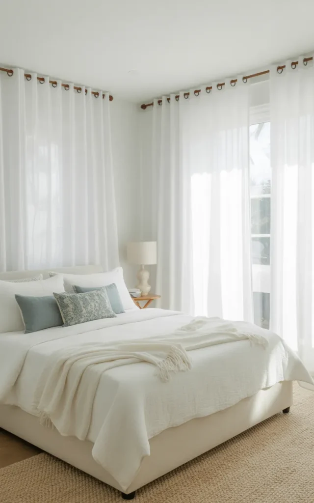 Add simple white decor and sheer curtains to keep the atmosphere clean and calming. It’s a peaceful retreat at any time of day.