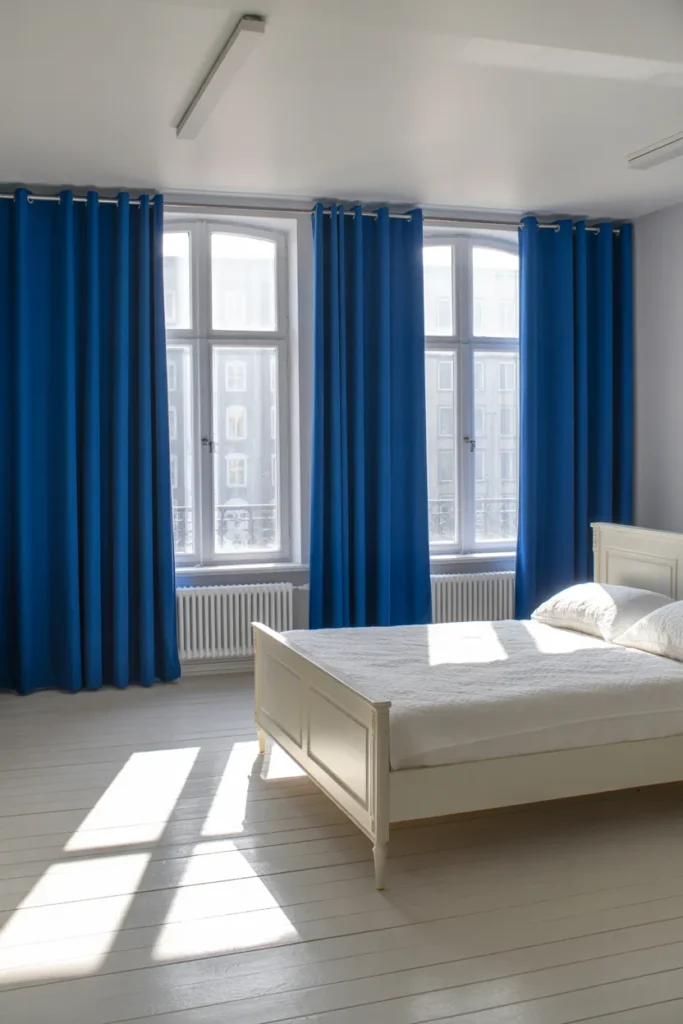 This design brings the feeling of the sea into your space. The combination of crisp white walls and ocean-blue sheets creates a refreshing, peaceful environment. Natural sunlight enhances the color balance, making the room look bright and inviting.