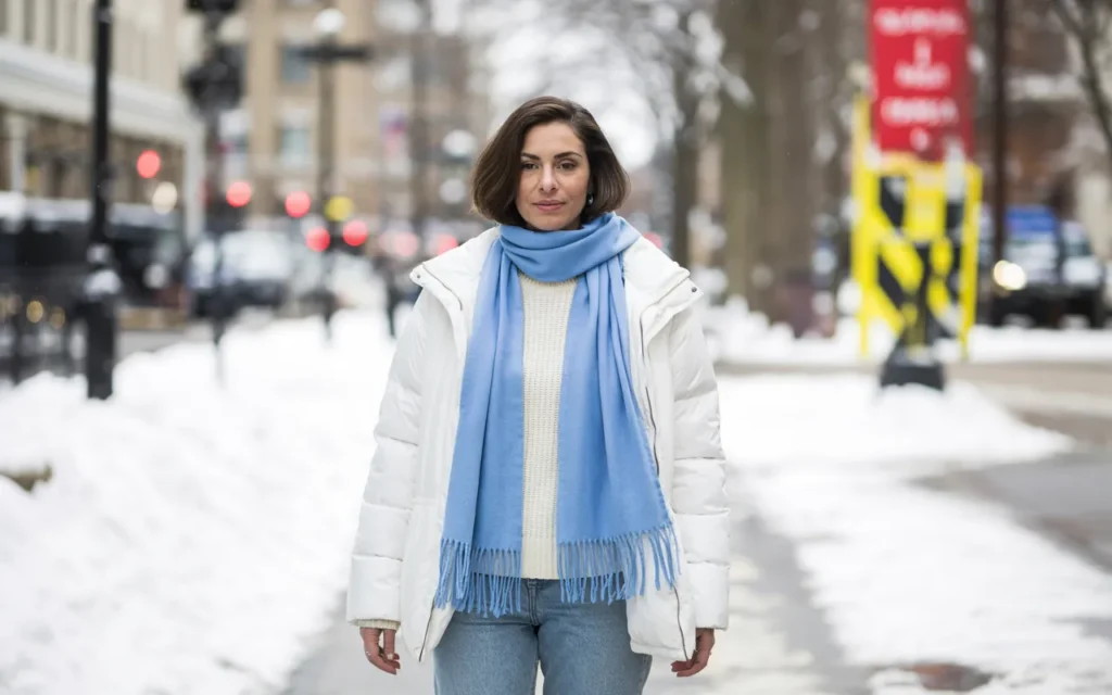 Sky-blue scarves add freshness and a dreamy feel to monochrome winter outfits. Layered over a white coat, the scarf becomes the focal point, brightening neutral tones. Light-wash jeans and a knit sweater keep the outfit casual yet elegant, creating a balanced winter look.