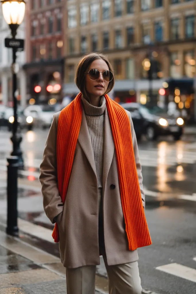 A pop of orange energizes a neutral winter outfit. Styled over a taupe coat, the scarf becomes the focal point, bringing cheer to gloomy weather. Neutral trousers balance the brightness, creating a harmonious look.