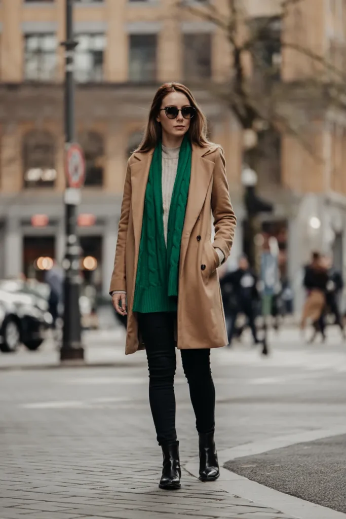 A camel coat paired with an emerald green scarf creates a striking winter contrast. The rich green adds life to neutral tones while remaining elegant and professional. Wrapped loosely, the scarf frames the face and brings a cozy vibe, perfect for city walks or casual meetings. Black skinny jeans and leather boots keep the outfit grounded, adding sleekness and balance.