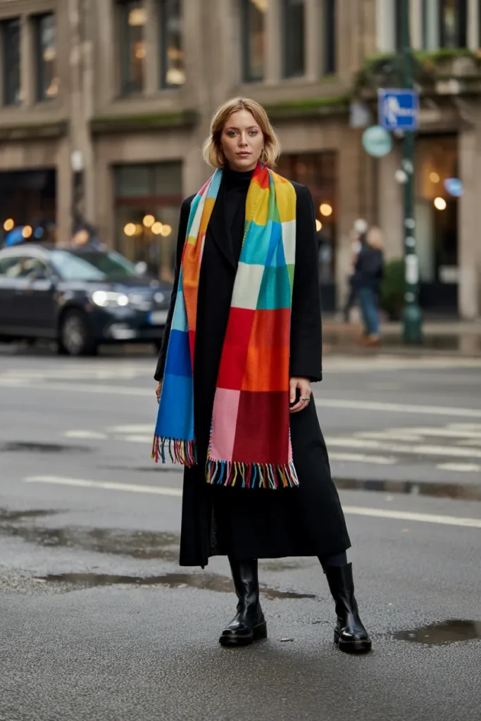 A multicolor chunky scarf adds vibrancy to a black coat outfit. The playful mix of colors brings energy to winter layers while keeping the base sophisticated. Styled voluminously, it doubles as a statement accessory and practical warmth. Black boots and a sleek coat ensure elegance and polish.