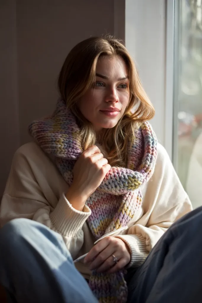This cozy winter look embraces comfort without sacrificing style. An oversized cream sweater feels soft and inviting, while a thick multicolor knitted scarf adds texture and visual warmth. Draped casually over the shoulders, the scarf becomes the focal point, introducing subtle color without overwhelming the outfit. The relaxed silhouette makes this look ideal for slow winter mornings, reading by the window, or content creation moments.