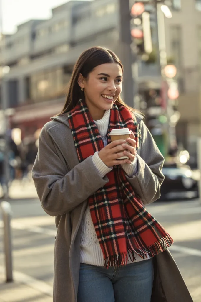 A gray wool coat offers a refined base for winter dressing, while a red plaid scarf injects warmth and personality. Layered over a white knit sweater, this outfit feels crisp, cheerful, and effortlessly stylish. The scarf adds a classic winter pattern that feels nostalgic yet modern, especially when styled loosely around the neck. Paired with minimal accessories, this look is perfect for everyday errands or coffee dates.