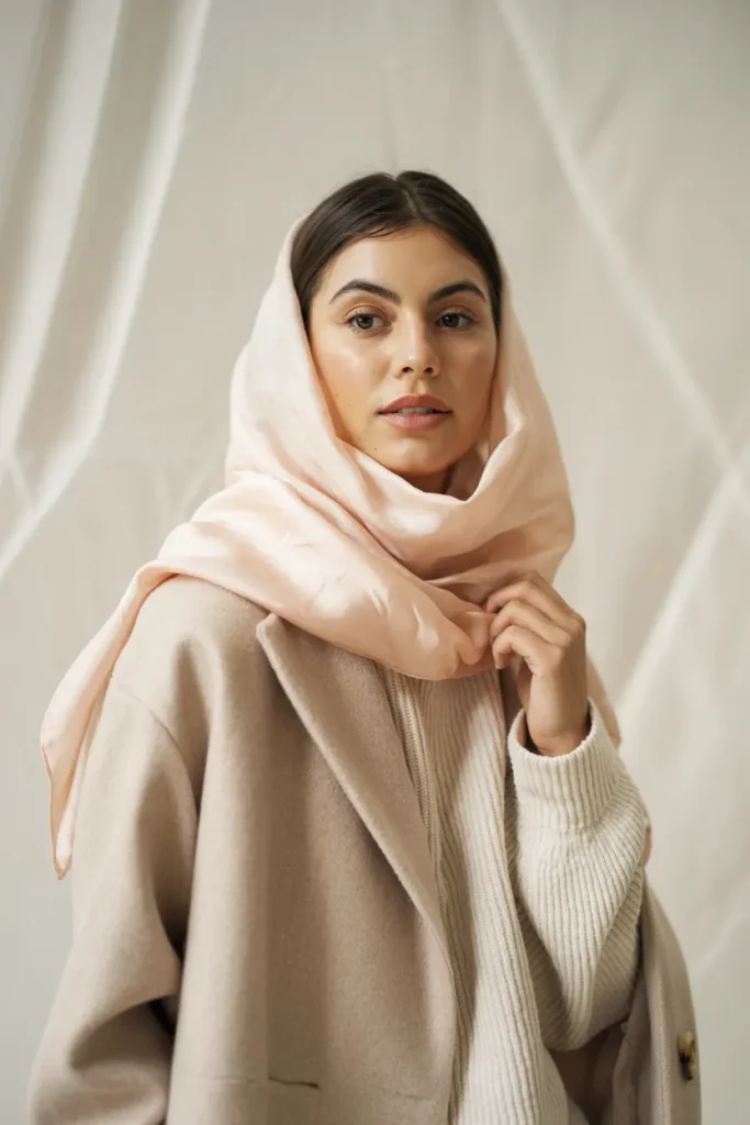 A pastel peach scarf brings gentle color to this minimal winter outfit. Paired with a beige coat and white knit sweater, it creates a soft, harmonious palette perfect for clean aesthetics. The scarf is styled simply, allowing its color to subtly enhance the neutral tones without overpowering them. This look feels refined, calm, and timeless.