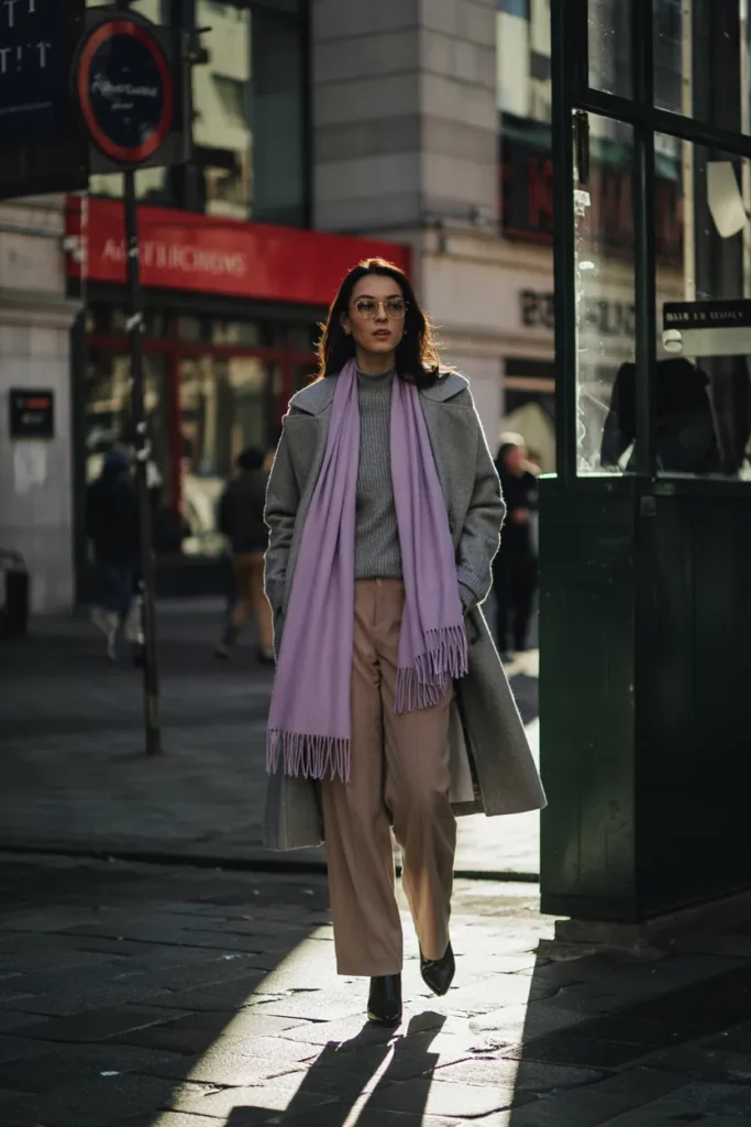 Lavender adds a dreamy pop to a gray winter palette. Paired with monochrome layers, this scarf creates visual interest without overwhelming the subtle base. A soft wool scarf layered over a gray coat feels cozy while maintaining minimal sophistication. Neutral trousers complete the outfit, balancing color with professional polish.