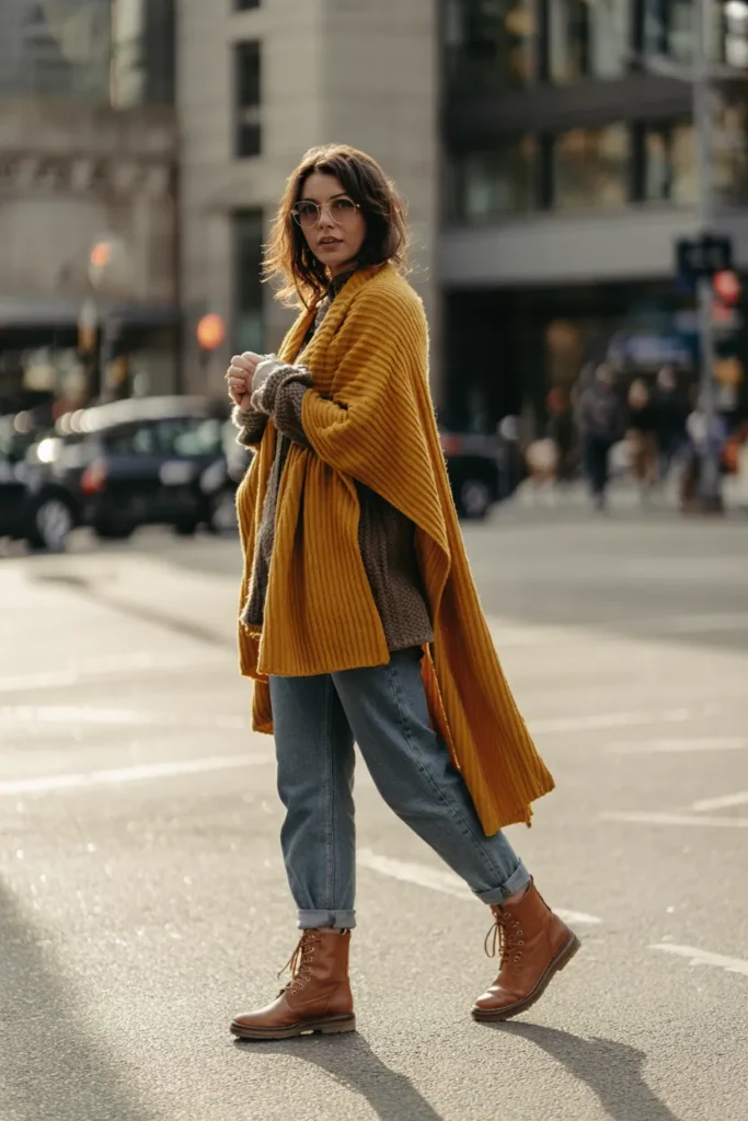 This outfit balances casual and chic elements. Mustard is visually striking against muted tones, making it ideal for Pinterest-style photography. The layered textures—from wool to denim—enhance coziness, giving the ensemble depth while remaining effortless and wearable for 2026.