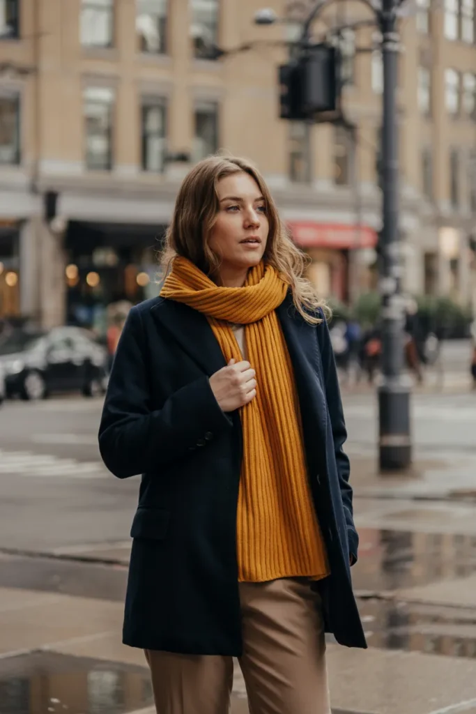 Mustard scarves provide a cheerful contrast to deep navy layers. The bright accessory injects warmth into darker neutrals, creating an inviting winter look. Neutral trousers and boots keep the outfit polished and wearable.