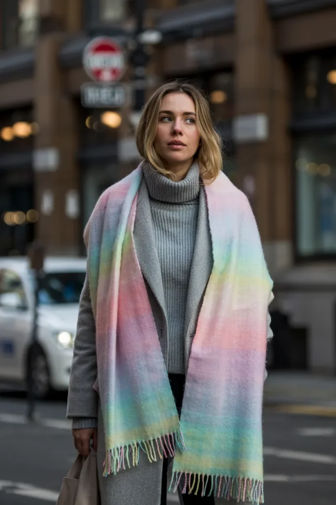 Pastel ombre scarves create dreamy transitions of color over neutral layers. Grey coats and sweaters serve as the perfect canvas, allowing soft pinks, blues, or lilacs to pop. Wrapped loosely, the scarf adds warmth, texture, and visual intrigue.