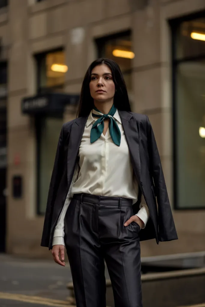 A teal silk scarf instantly elevates a tailored blazer outfit. The scarf adds a touch of luxury and color, contrasting softly against neutral layers. Paired with a crisp blouse and trousers, it keeps the ensemble professional while introducing subtle elegance and movement. Perfect for office wear or winter meetings, it’s sophisticated yet cozy.