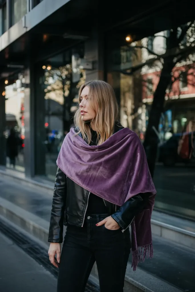 Purple velvet scarves add luxury and drama to casual winter layers. Styled with a black leather jacket, it balances edgy and elegant vibes. The texture and color pop against neutral layers, creating a visually captivating outfit.