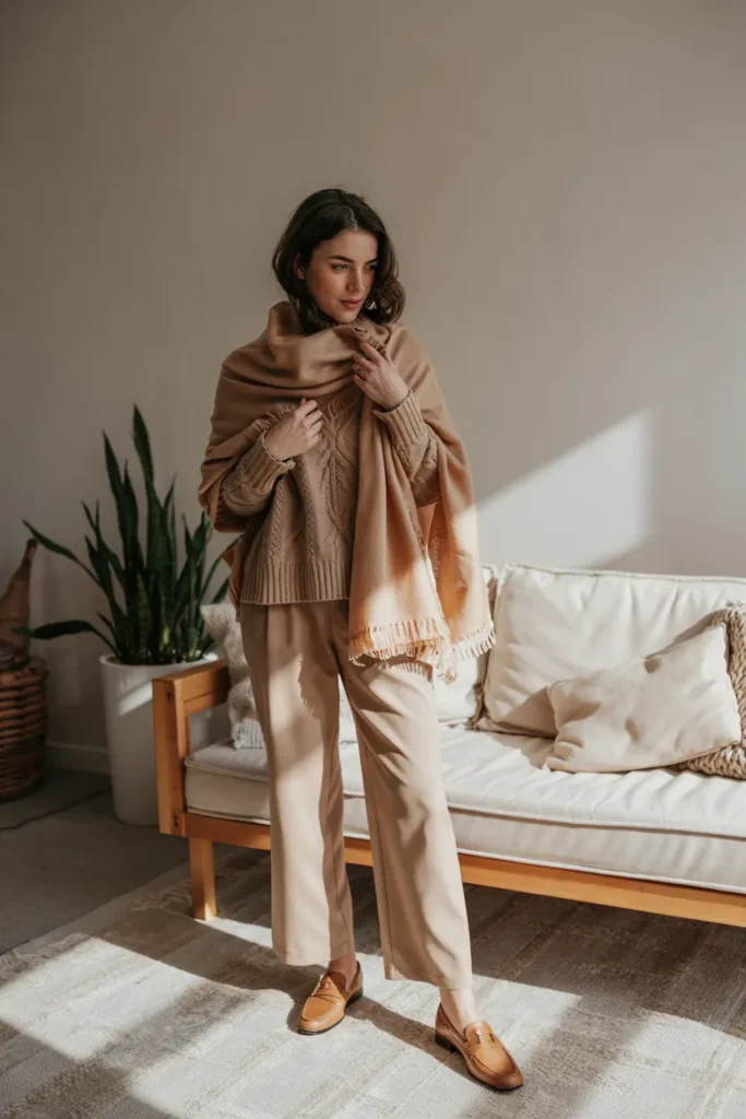 A neutral scarf layered over a camel sweater creates a soft, cohesive color palette. The look is cozy and sophisticated, perfect for office or indoor settings. Light trousers complete the outfit, ensuring balance and elegance.