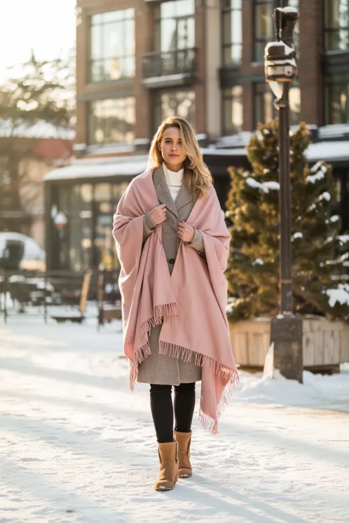 This outfit feels approachable and romantic. Pinterest audiences love blanket scarves for their photogenic, cozy aesthetic. The soft pink hue enhances neutral coats, making the ensemble dreamy and timeless.
