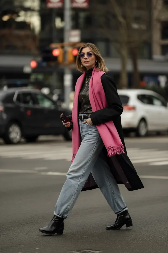 A long black coat paired with light blue denim creates a timeless winter foundation, but the bright pink knitted scarf steals the spotlight. Wrapped loosely around the neck, it adds playful contrast against neutral tones while maintaining elegance. The straight-leg jeans and ankle boots keep the look modern and wearable, perfect for city walks or casual workdays. This outfit balances classic winter tailoring with youthful color, making it ideal for Pinterest street-style boards.