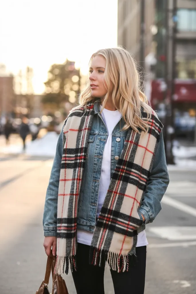 15. Oversized Plaid Scarf with Denim Jacket