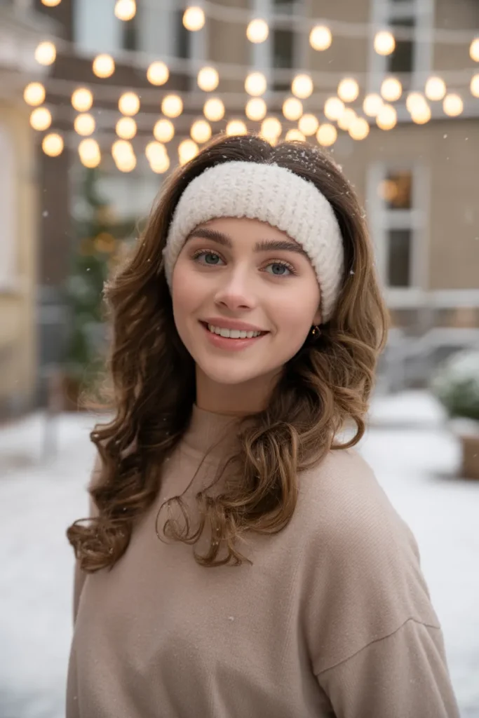 Loose curls paired with a knit headband make a cozy winter hairstyle that still looks pretty for holiday events. The headband keeps the ears warm and adds a soft seasonal touch. Sam likes using gentle curls for this style to keep the look relaxed but still photo-ready. It’s a comfortable choice for outdoor gatherings or casual Christmas get-togethers.