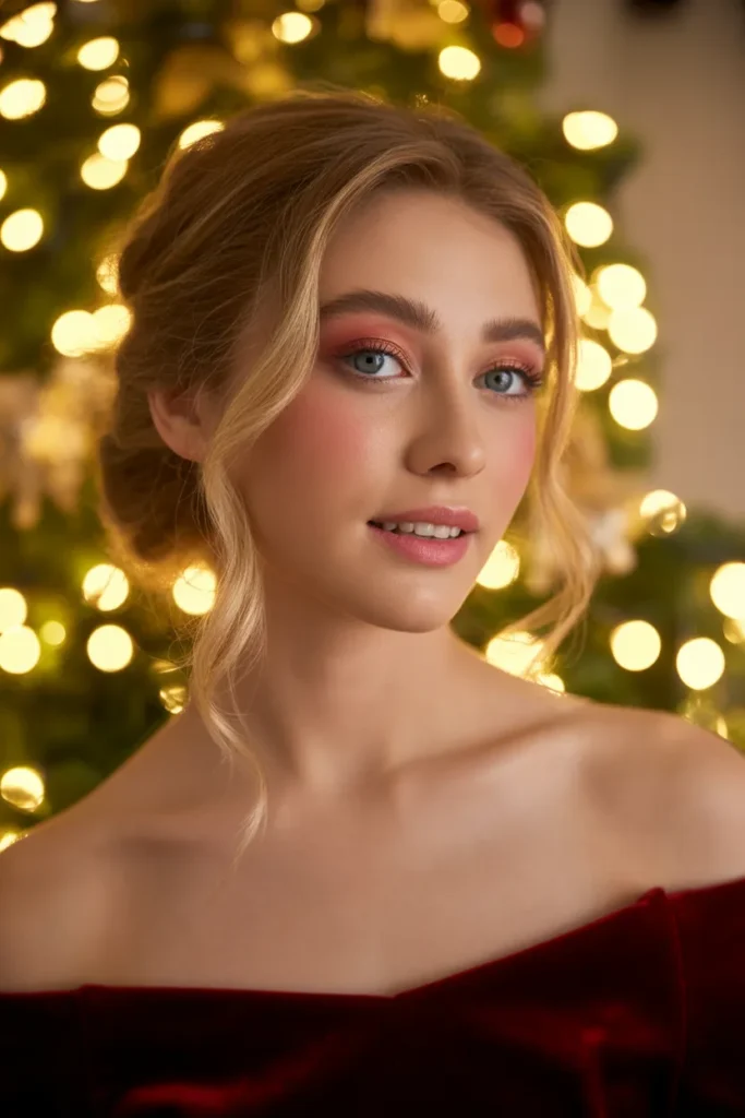 A soft face-framing updo brings a gentle and warm holiday look. The loose pieces near the cheekbones make the style feel natural without losing elegance. This hairstyle works well with velvet dresses since the open neckline highlights the updo’s softness. The warm glow of Christmas lights often enhances this style by bringing gentle shine to the blonde curls.