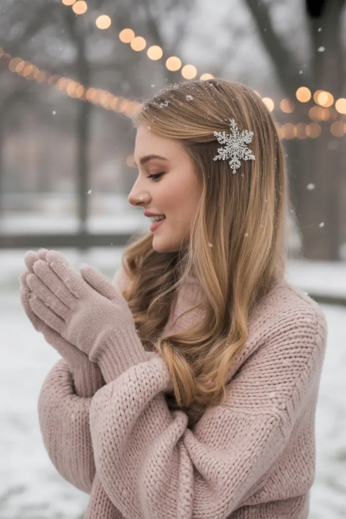 The soft snowfall makes the hair look even more delicate, especially when it catches the falling flakes. It’s an ideal choice for casual gatherings, outdoor Christmas markets, or winter photoshoots. The snowflake detail gives just enough holiday sparkle.