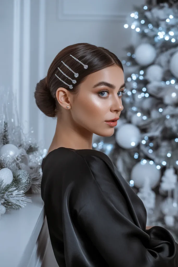 A sleek low bun with crystal pins delivers a clean and polished holiday look. The smooth styling keeps everything neat while the crystal accents bring sparkle without needing large accessories. This hairstyle pairs perfectly with satin or black outfits because the shine from the crystals complements the fabric. It’s a simple but striking choice for winter parties.