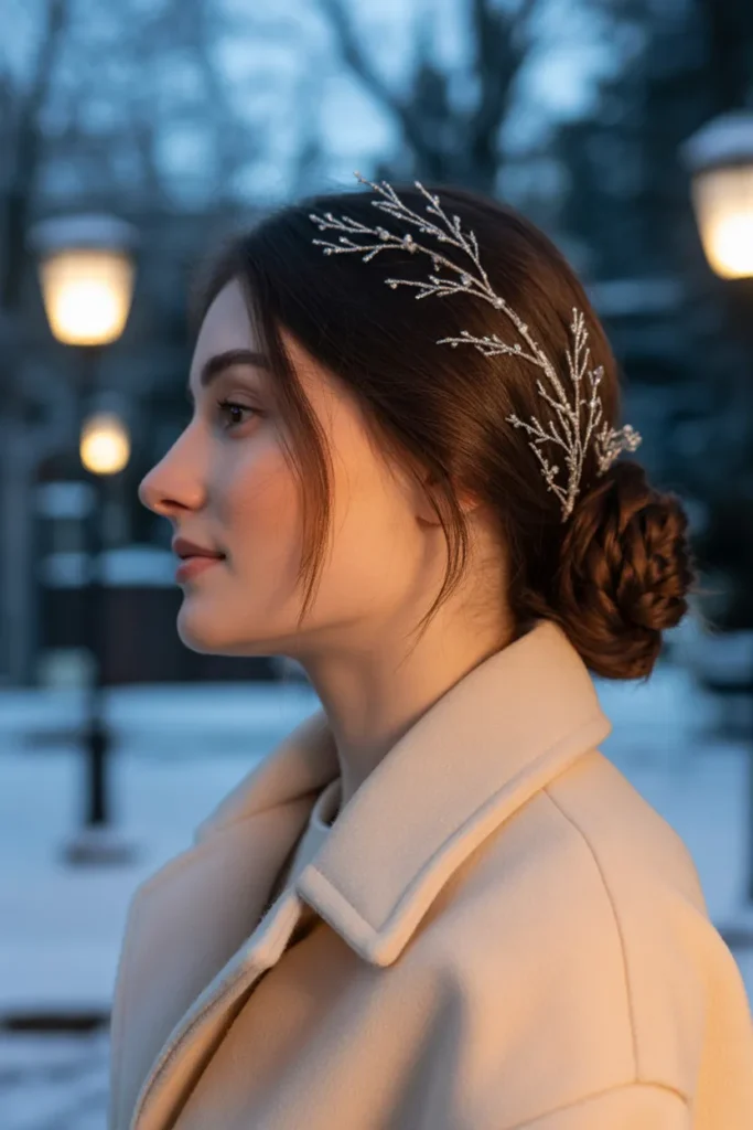 A twisted low bun decorated with winter branch pins creates a soft winter style that feels refined and seasonal. The silver pins add a frosty sparkle that pairs well with cool outdoor lighting. Sam likes this hairstyle for outdoor Christmas photos or evening walks through holiday displays.