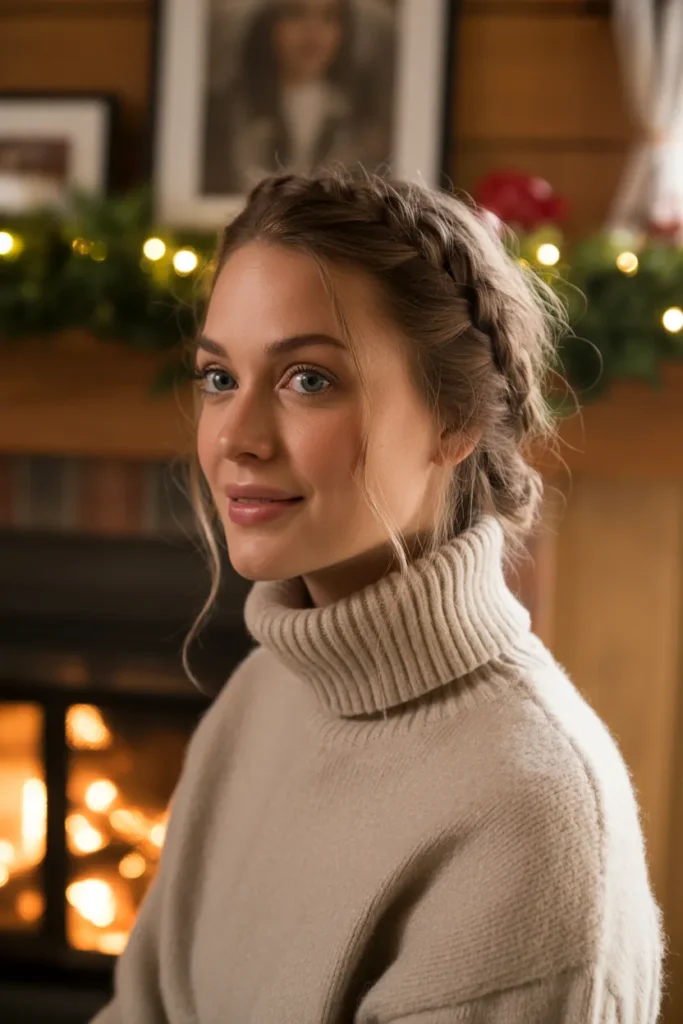 This hairstyle is perfect for cozy indoor events or casual Christmas gatherings. The crown braid stays secure throughout the night, making it easy to enjoy holiday treats and time with loved ones. It photographs well thanks to the layered texture and warm winter lighting.