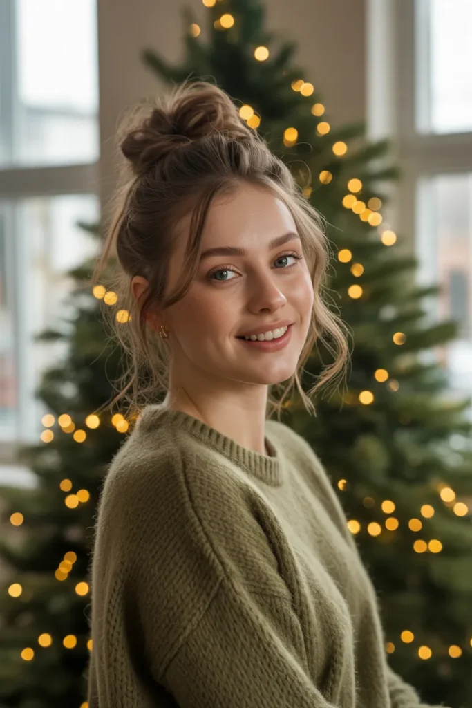 A soft messy bun is a perfect choice for relaxed Christmas gatherings. The loose tendrils add sweetness and frame the face gently, creating a warm and approachable style. Sam likes this hairstyle for morning celebrations or family parties where comfort is important. It looks effortless but still festive.