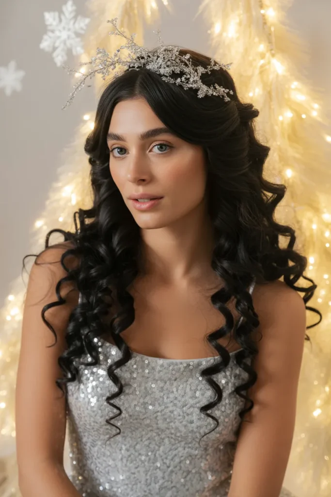 The falling snow and warm lights often enhance the curls, giving them more depth and shine. This hairstyle works well with sweaters and winter coats, making it great for outdoor celebrations or photoshoots. It looks natural and warm, perfect for anyone who wants a laid-back holiday look that still feels special.