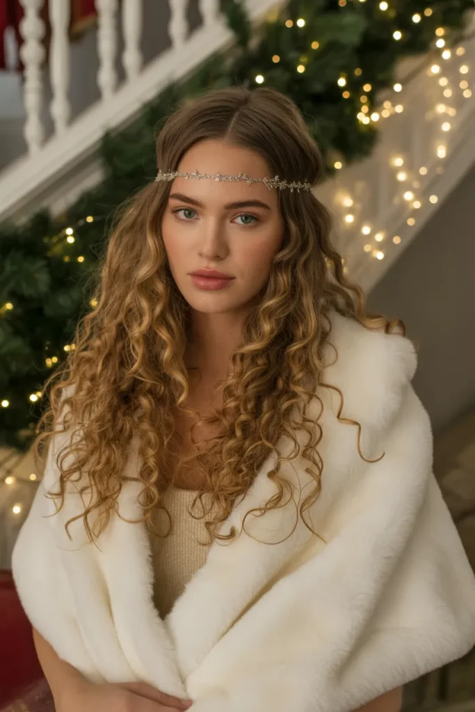 The glowing lights around the staircase reflect on the curls, making them look full and shiny. This hairstyle works well with fur-trimmed wraps or elegant dresses. It’s perfect for holiday gatherings, photoshoots, or evenings spent celebrating with friends.