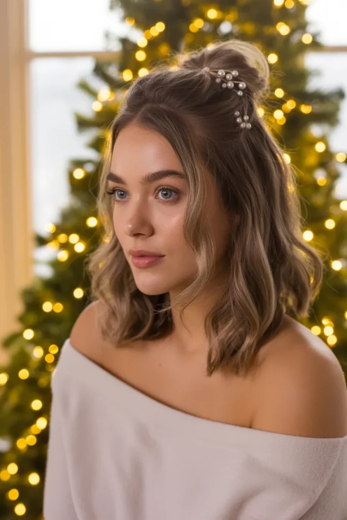 A half-up bun with small pearls brings a soft, romantic look perfect for Christmas celebrations. The loose waves frame the shoulders and help the hairstyle feel feminine without being too formal. Sam loves adding tiny pearls because they sparkle gently under warm holiday lights. This look works especially well indoors, where the bokeh from the tree lights reflects off the pearls beautifully.