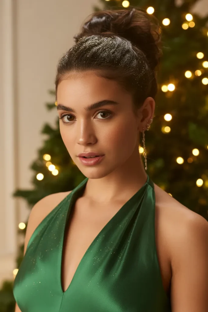 A textured high bun offers a bold and stylish holiday look. Adding a light glitter spray gives the bun a soft shimmer under Christmas lights. Sam uses this style for parties where you want a modern and eye-catching appearance. The texture keeps the bun from looking too strict, giving it a fun holiday twist.