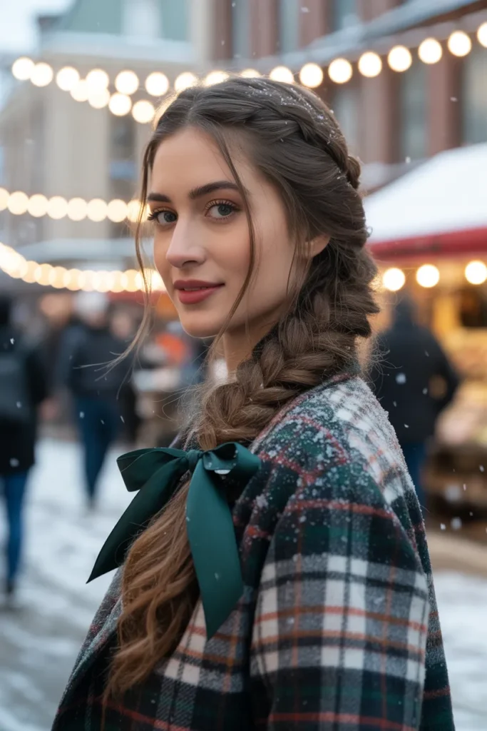 The falling snow and warm market lights add charm to the style, making it great for Christmas market visits or outdoor gatherings. This hairstyle photographs well because the ribbon and braid catch light in a subtle, pretty way.