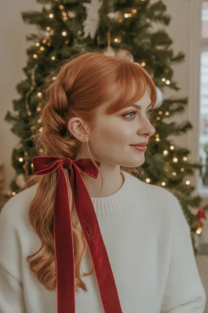 A high ponytail tied with a Christmas ribbon creates a simple but festive holiday look. The red satin ribbon brings a bright pop of color and makes the hairstyle feel cheerful and fun. Curling the ends adds movement and gives the ponytail a soft, party-ready finish. Sam likes this style for holiday brunches or fun gift-exchange parties.