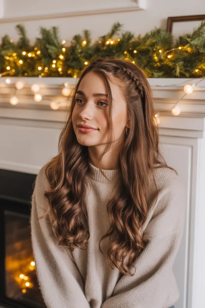 Warm lighting from the Christmas décor brings out the shine in the waves, giving the hairstyle a cozy feel. It’s a great option for low-key gatherings where you want to look festive but relaxed. The braid stays secure, making it easy to wear through the evening.