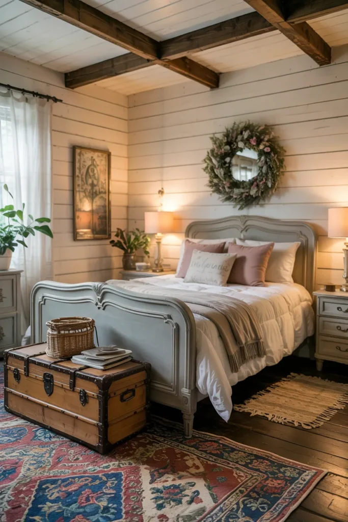 Vintage trunks under the bed add charm while storing seasonal clothing or keepsakes. They’re decorative and practical at the same time.