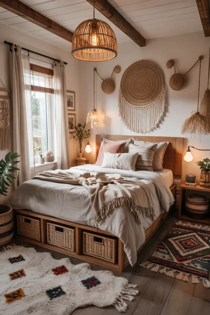 2. Cozy Boho Bed with Woven Storage Baskets