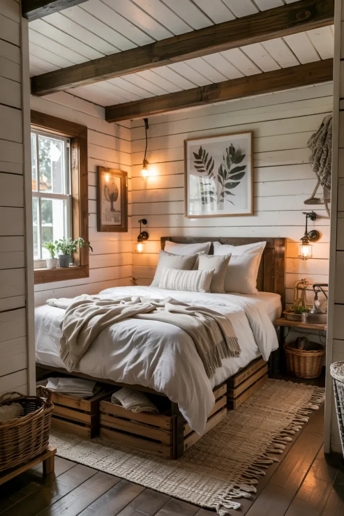 Wooden crates under the bed add rustic charm while providing functional storage for books, shoes, or folded clothes. Their raw texture adds warmth and character to small bedrooms.