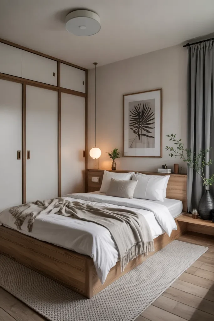 This idea creates a serene, clutter-free bedroom environment. It’s ideal for tiny rooms centered on mindfulness and intentional living.